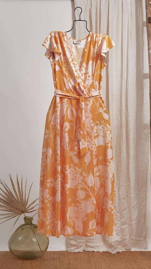 Vestido midi con silueta wrap, y manga corta.