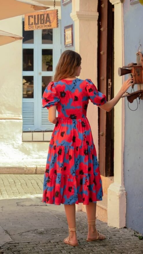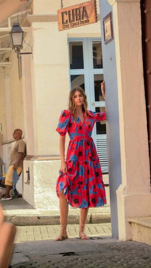 vestido midi con silueta wrap en estampado floral rojo, de fondo azul