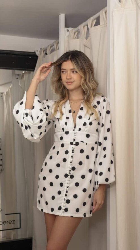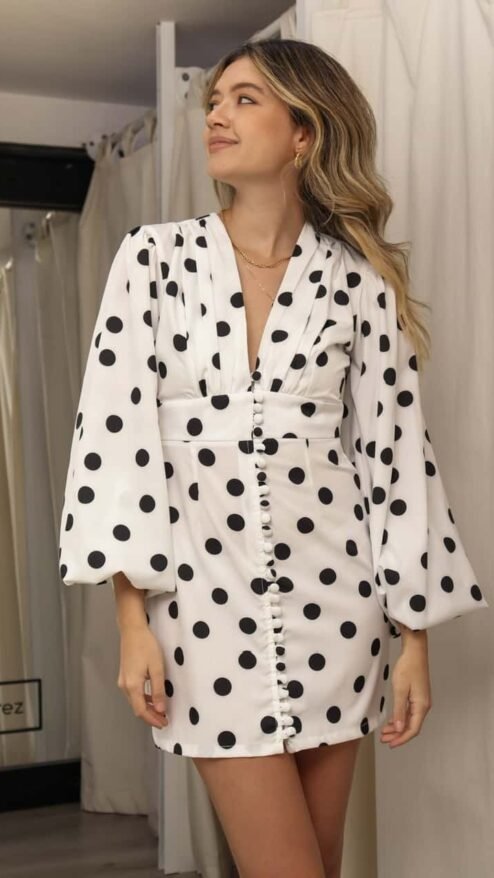 Vestido mini de cuello en V, manga larga muy amplia bombacha, se cierra con botones en la parte frontal (puedes elegir si usas un escote más profundo), estampado de puntos negros, de fondo blanco.