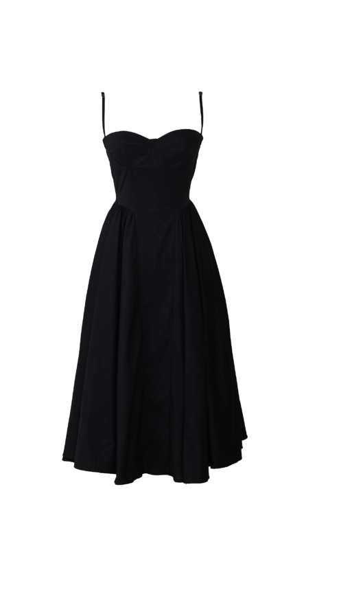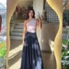 Con una silueta fluida y femenina, Neblina combina un top smocked que abraza suavemente el torso, favoreciendo, moldeando y dando soporte, con una falda amplia que se abre con cada paso como un soplo de aire cálido.