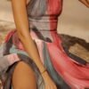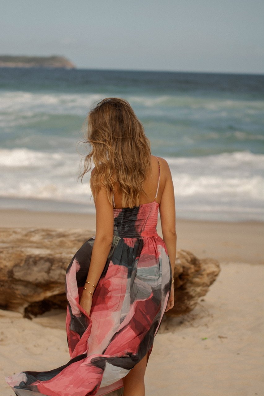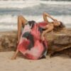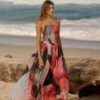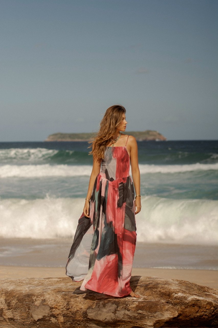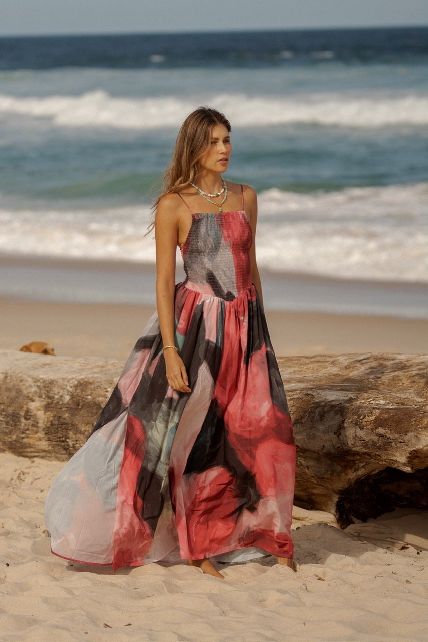 Su estampado artístico en tonos coral, rosado, menta y sombras profundas crea un efecto acuarelado que parece despertar bajo la luz del día. La ubicación del estampado puede variar.