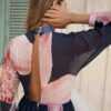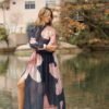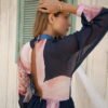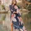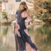 Su estampado floral en tonos rosa suave sobre un fondo azul profundo crea un contraste poético y etéreo, como pétalos flotando sobre el mar. La ubicación del estampado puede variar.
