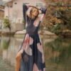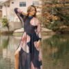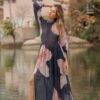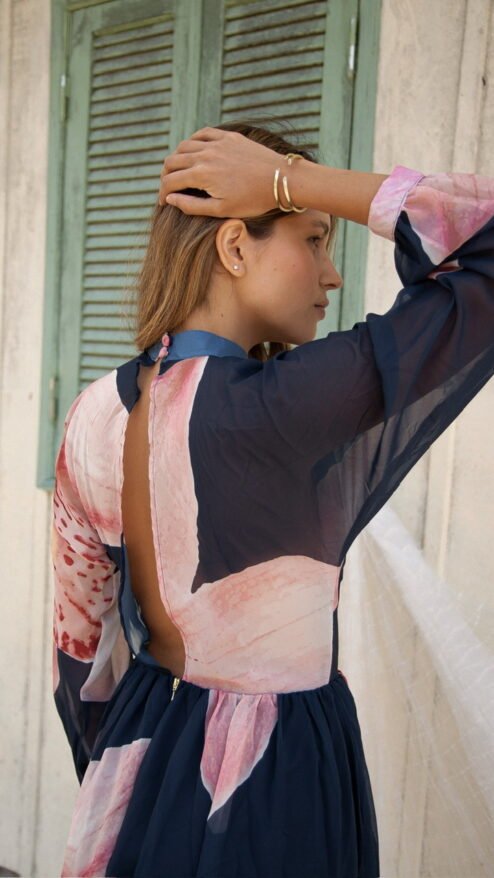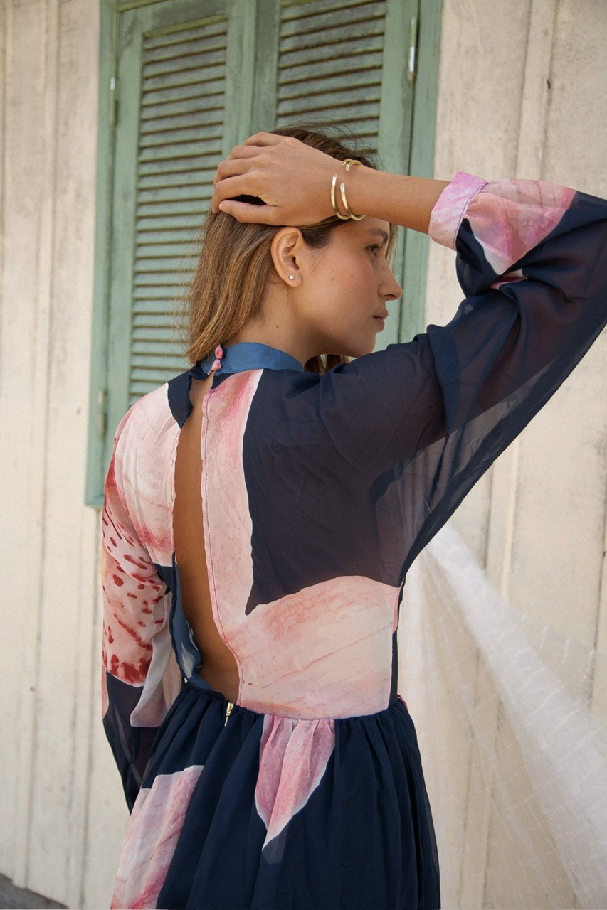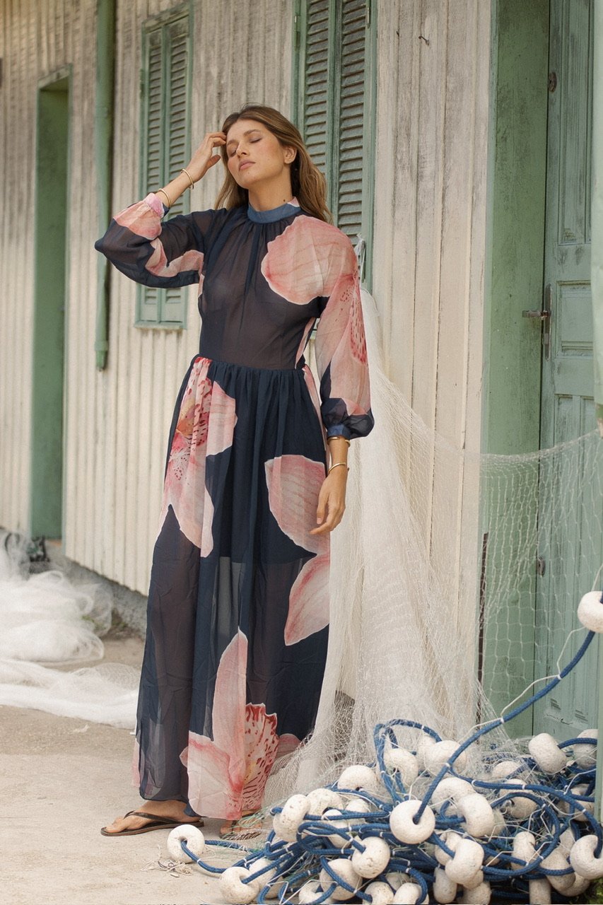 Orquídea es un maxi vestido de silueta vaporosa y caída fluida, diseñado para moverse contigo. Presenta un delicado cuello elevado que aporta elegancia moderna y mangas largas translúcidas que enmarcan los brazos con suavidad.