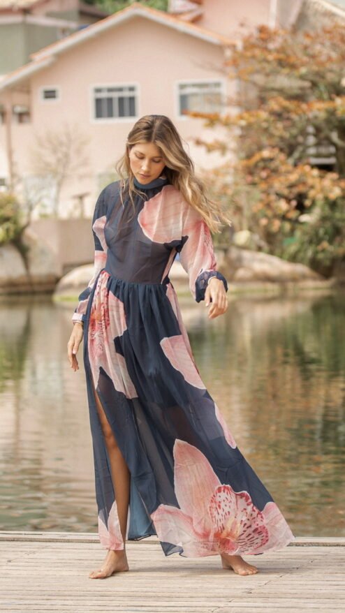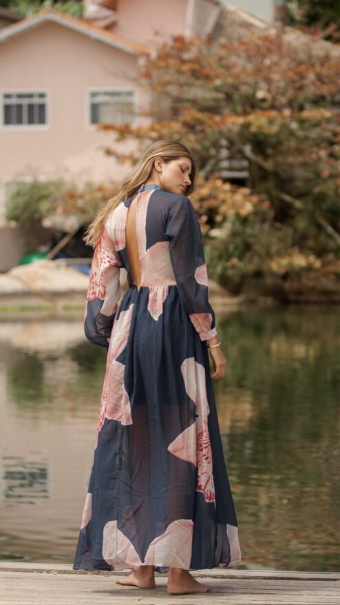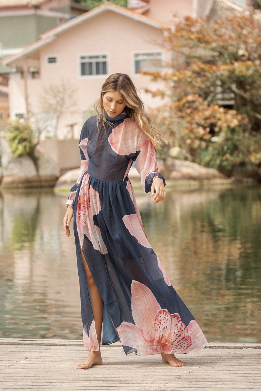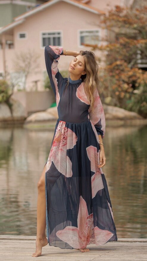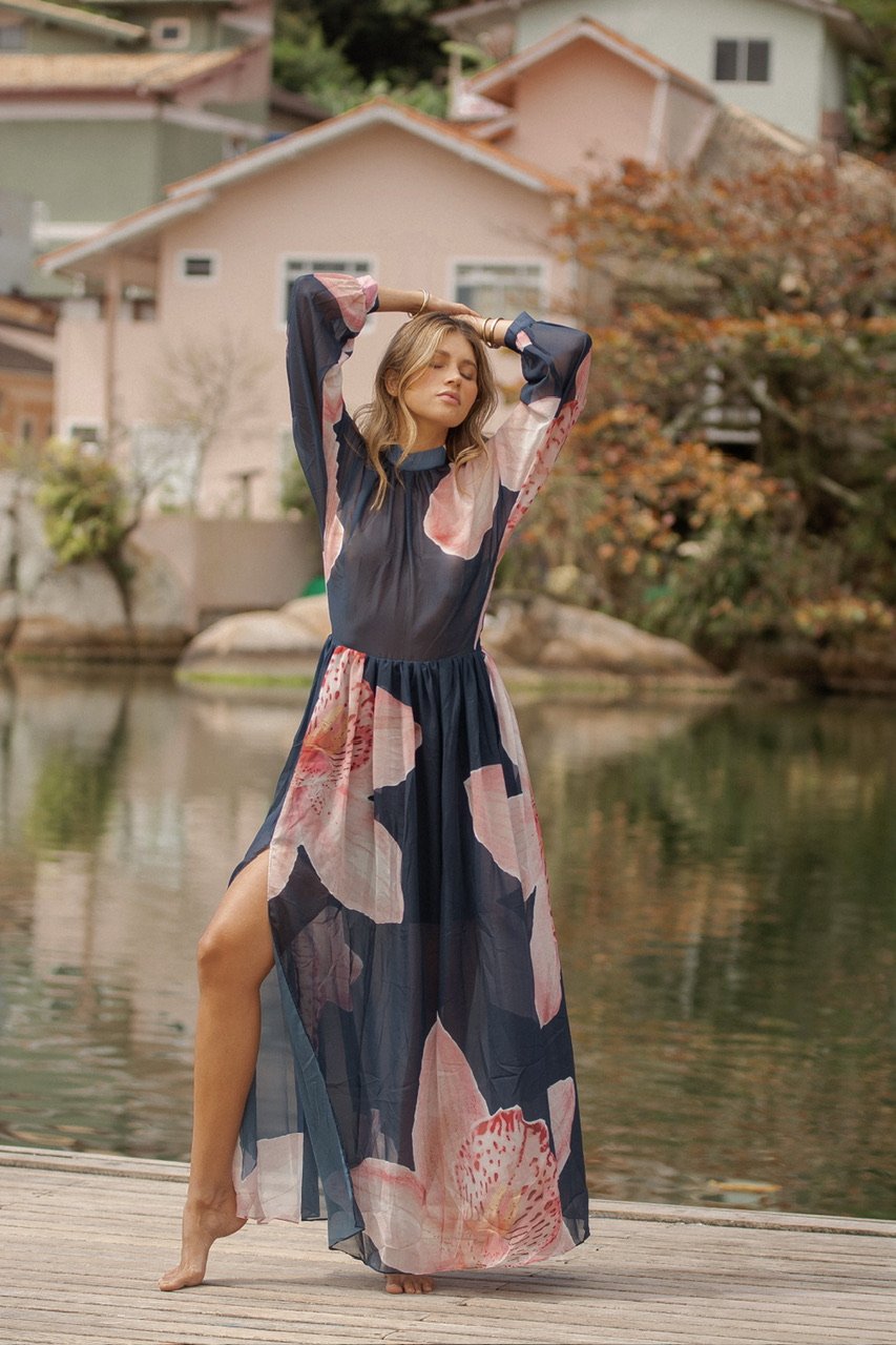 Entre el reflejo del agua y el murmullo suave del viento, nace Orquídea: una pieza que captura la esencia más serena y luminosa de Florianópolis. Es ese vestido que te acompaña cuando caminas sin prisa, cuando te descubres más liviana, más tú. Su movimiento etéreo invita a disfrutar la belleza sencilla del día, a respirar profundo, a sentir cómo la feminidad latina se expresa con libertad y sofisticación natural.