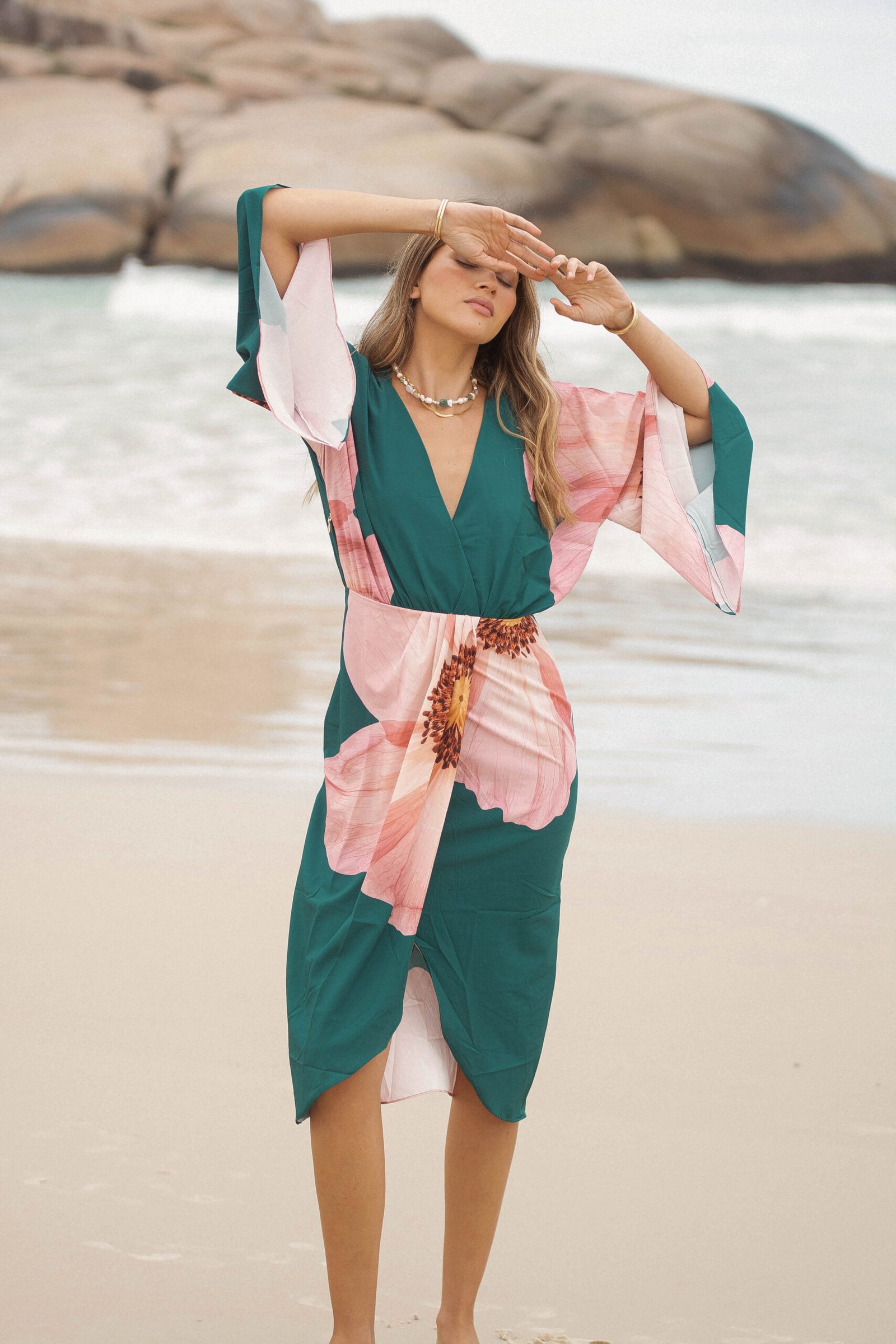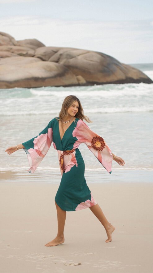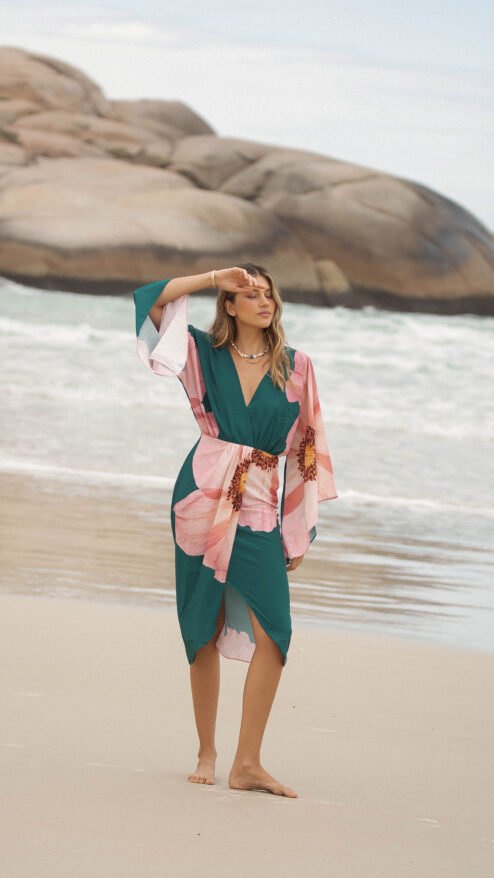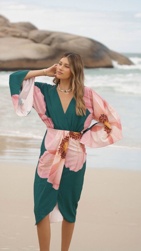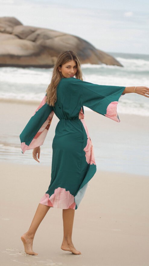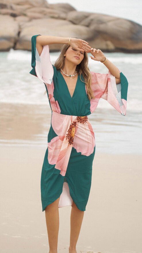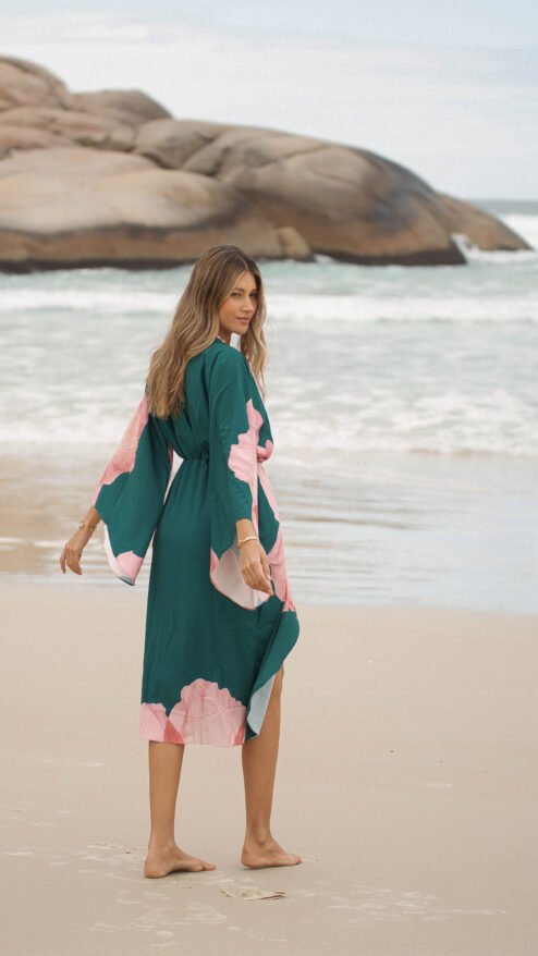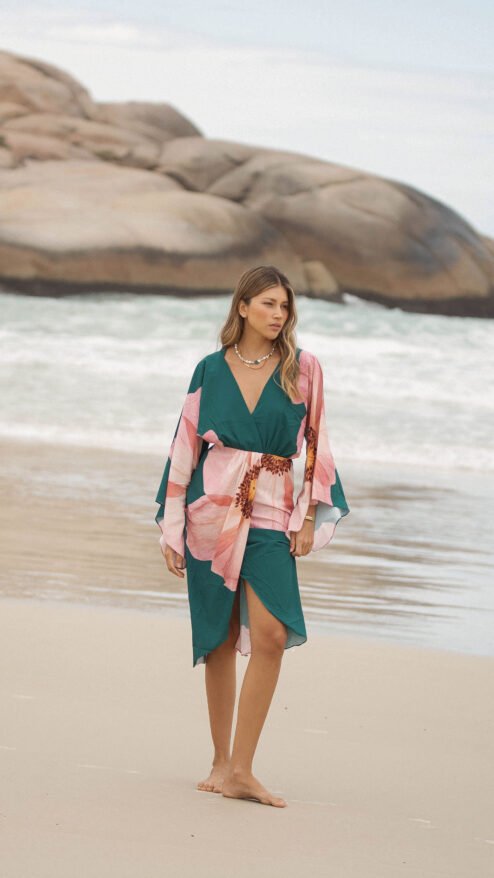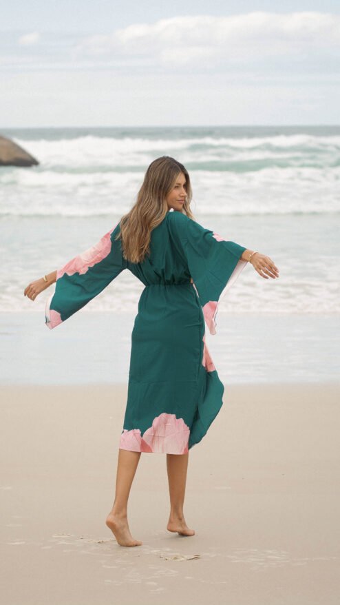 El verde profundo del fondo se encuentra con un estampado floral en tonos rosados, una flor que parece abrirse sobre la tela como si respirara con la brisa del mar: romántica, imponente y luminosa.