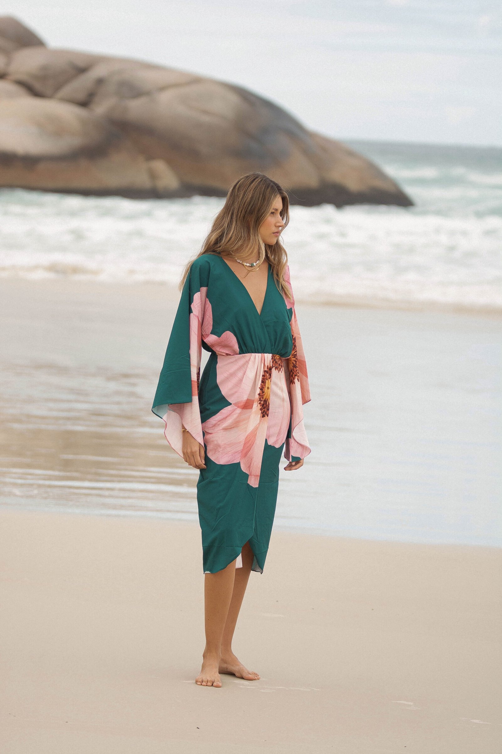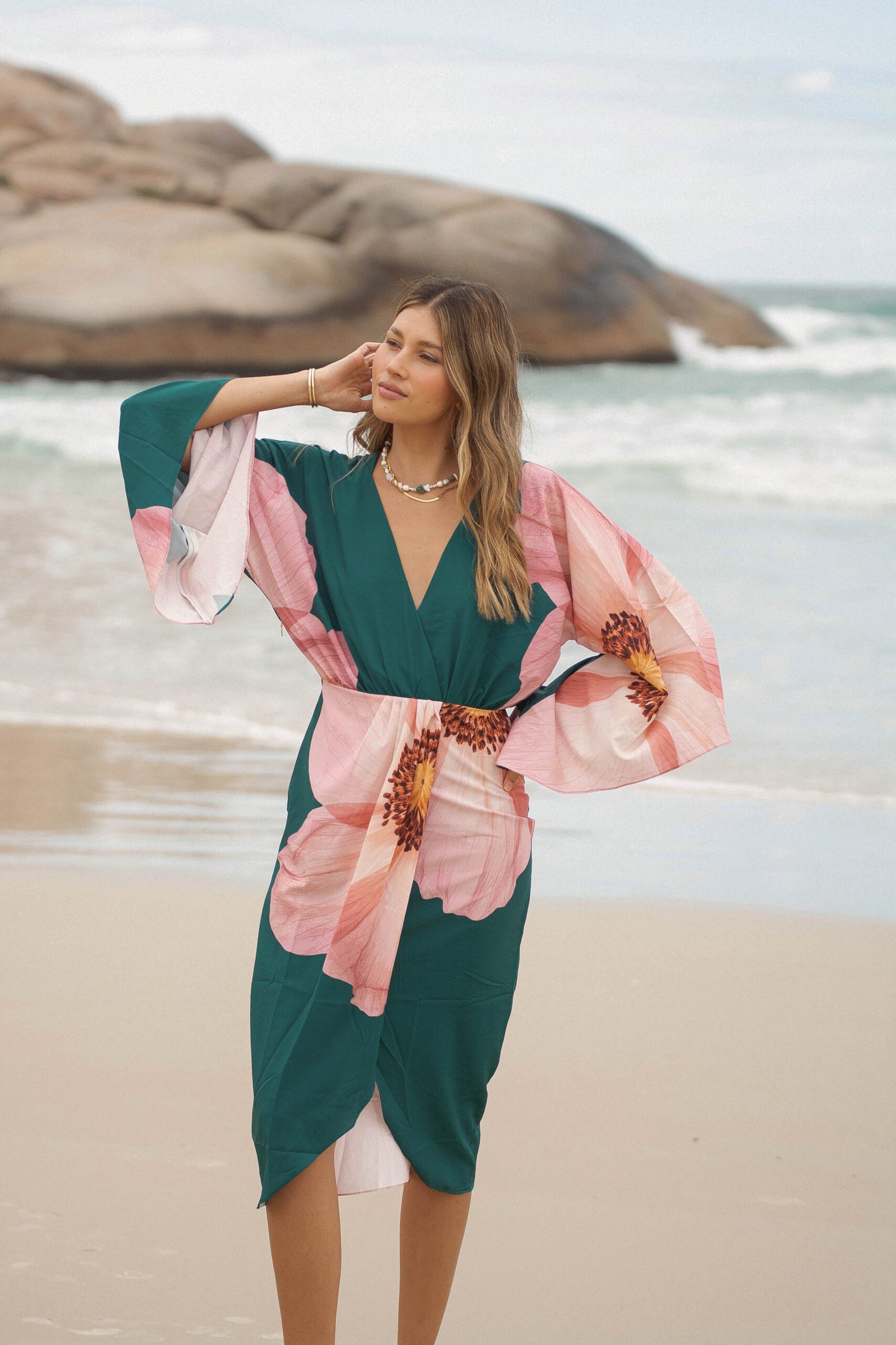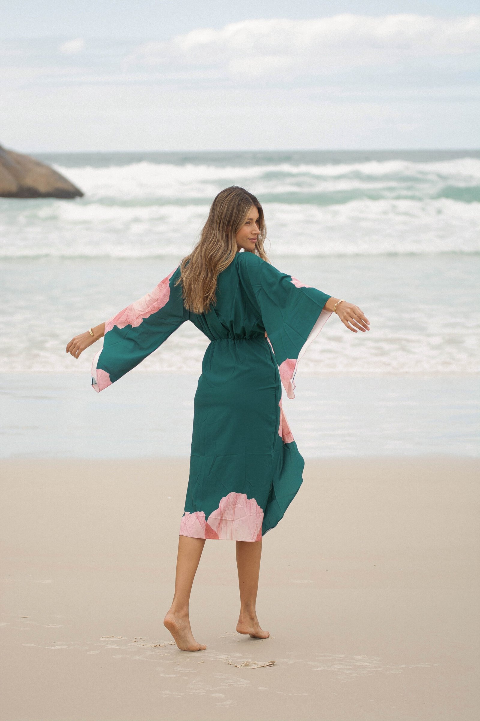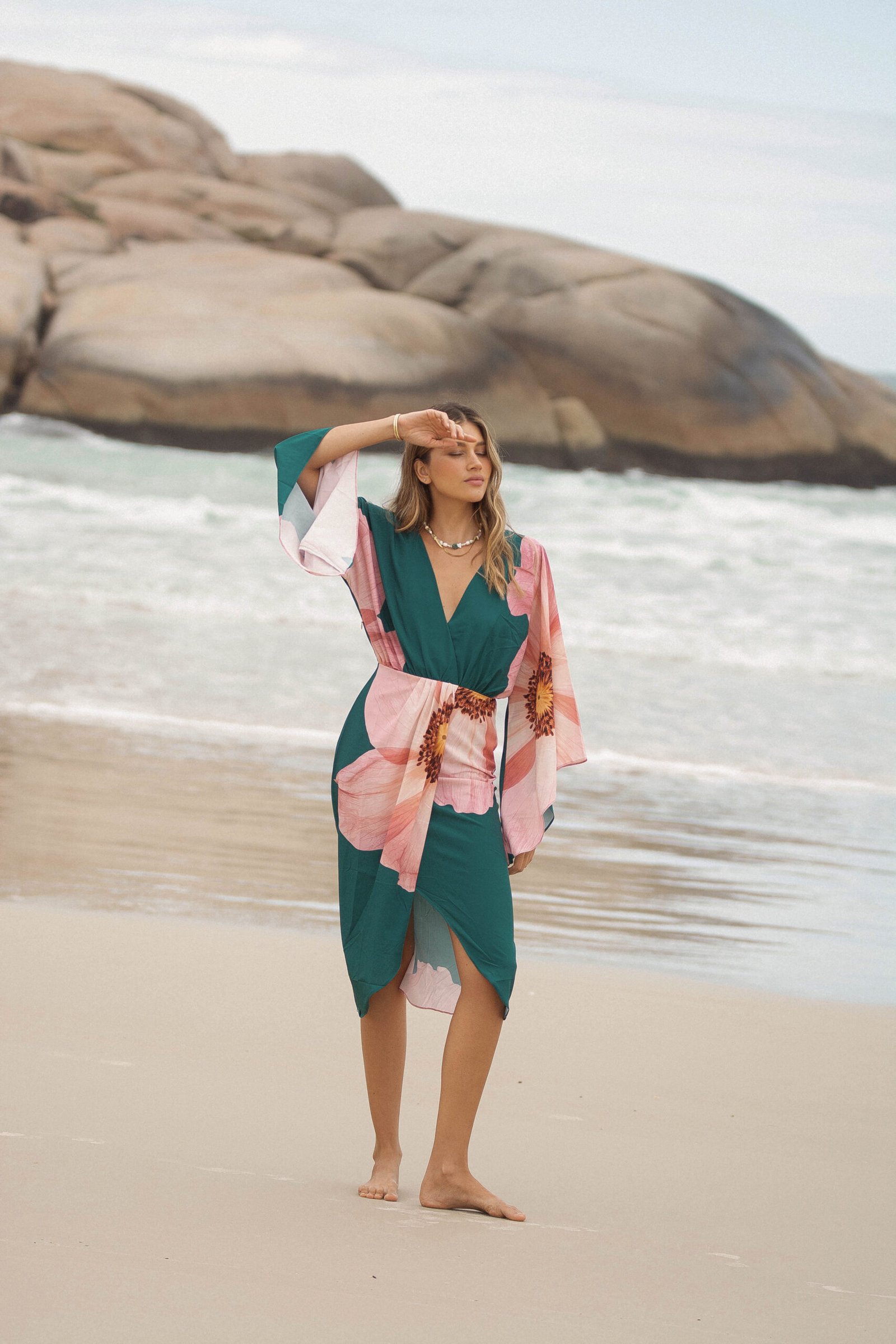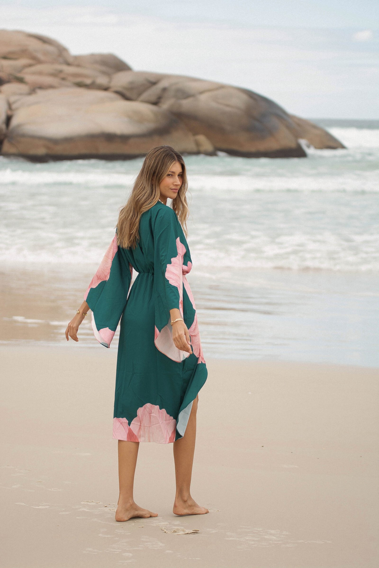 El verde profundo del fondo se encuentra con un estampado floral en tonos rosados, una flor que parece abrirse sobre la tela como si respirara con la brisa del mar: romántica, imponente y luminosa.