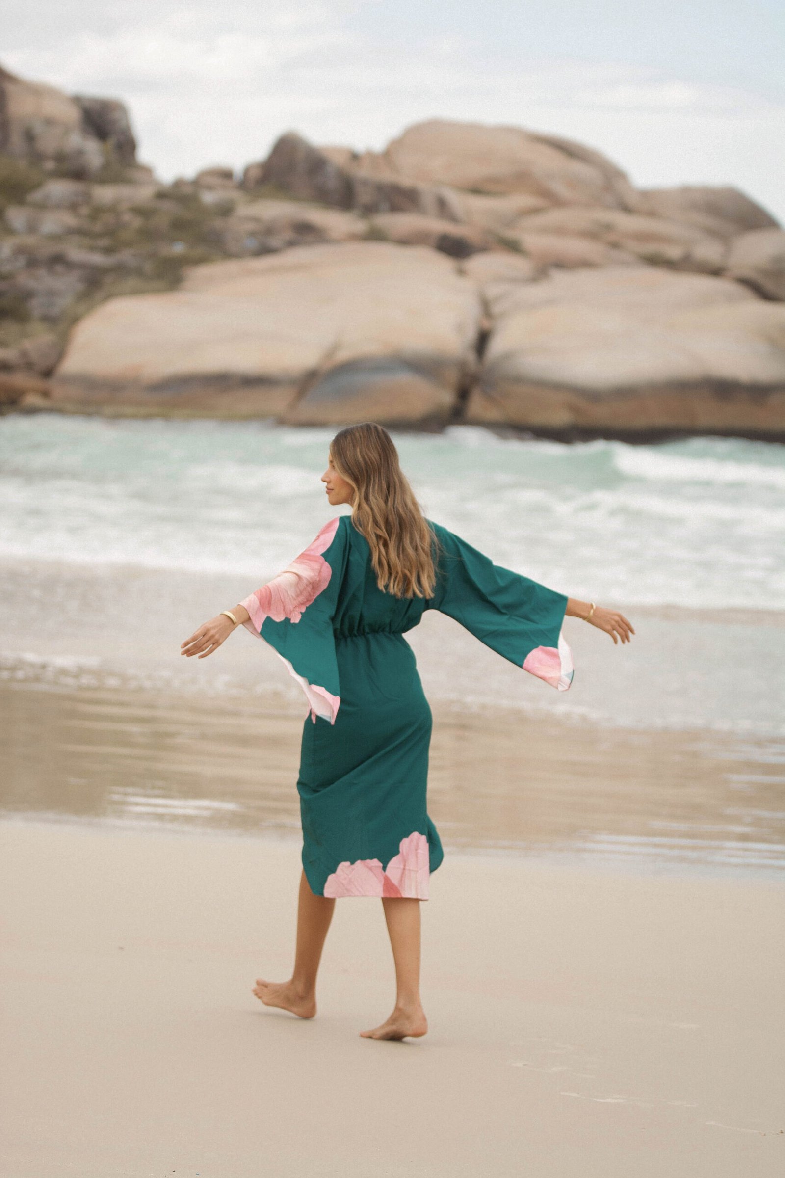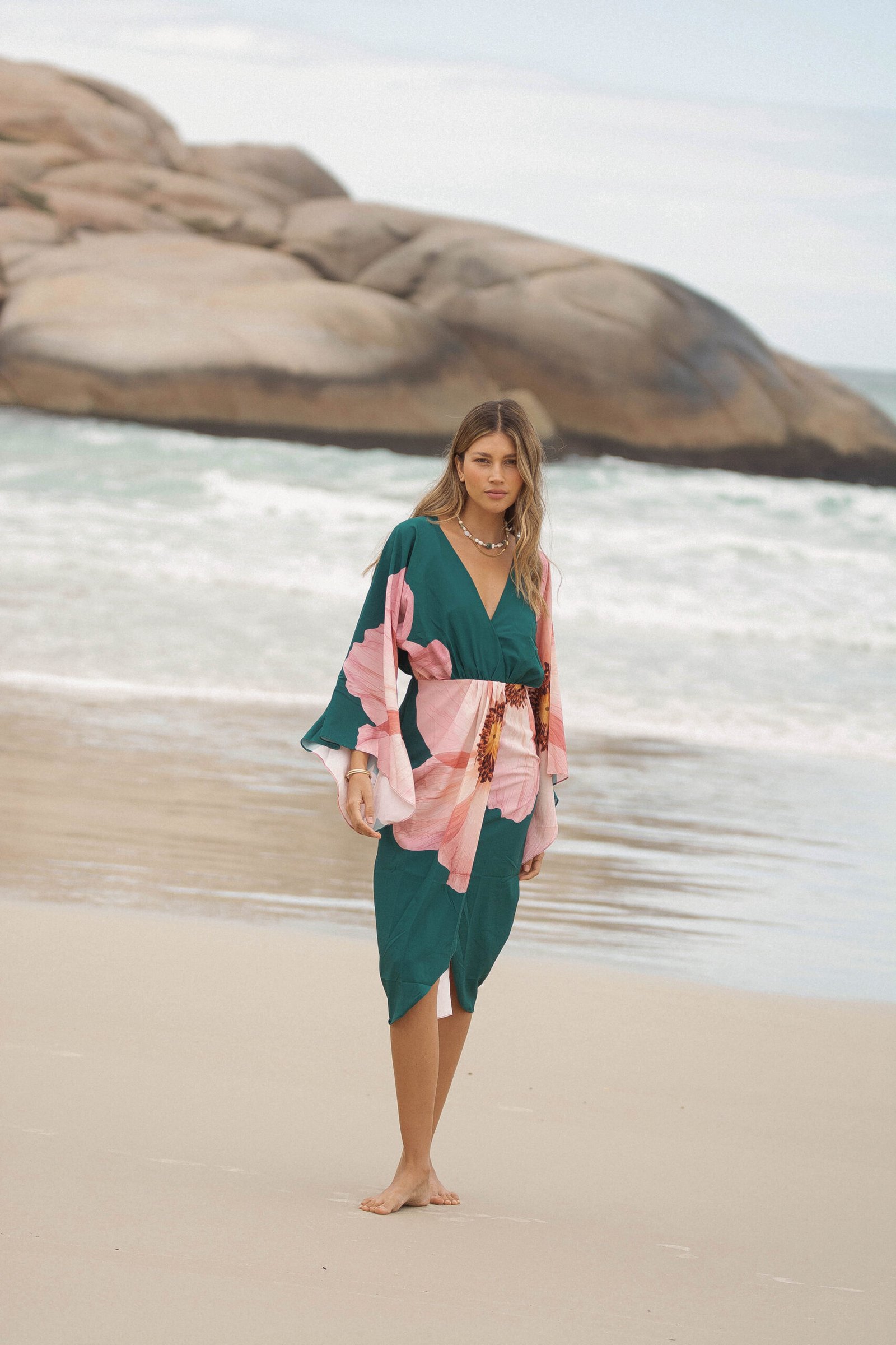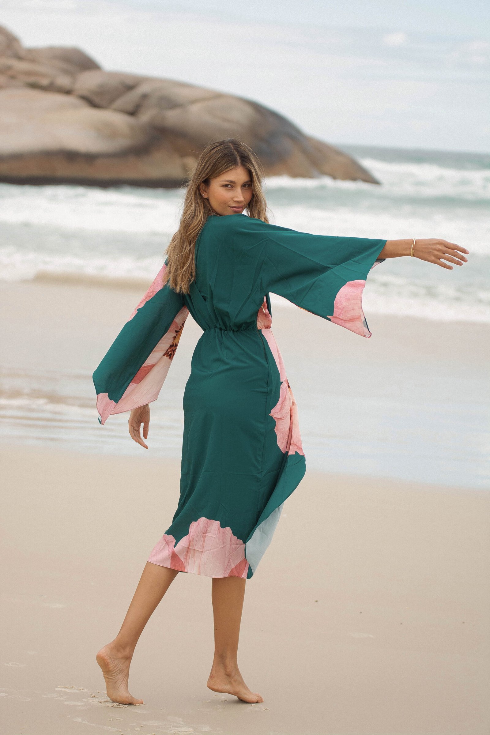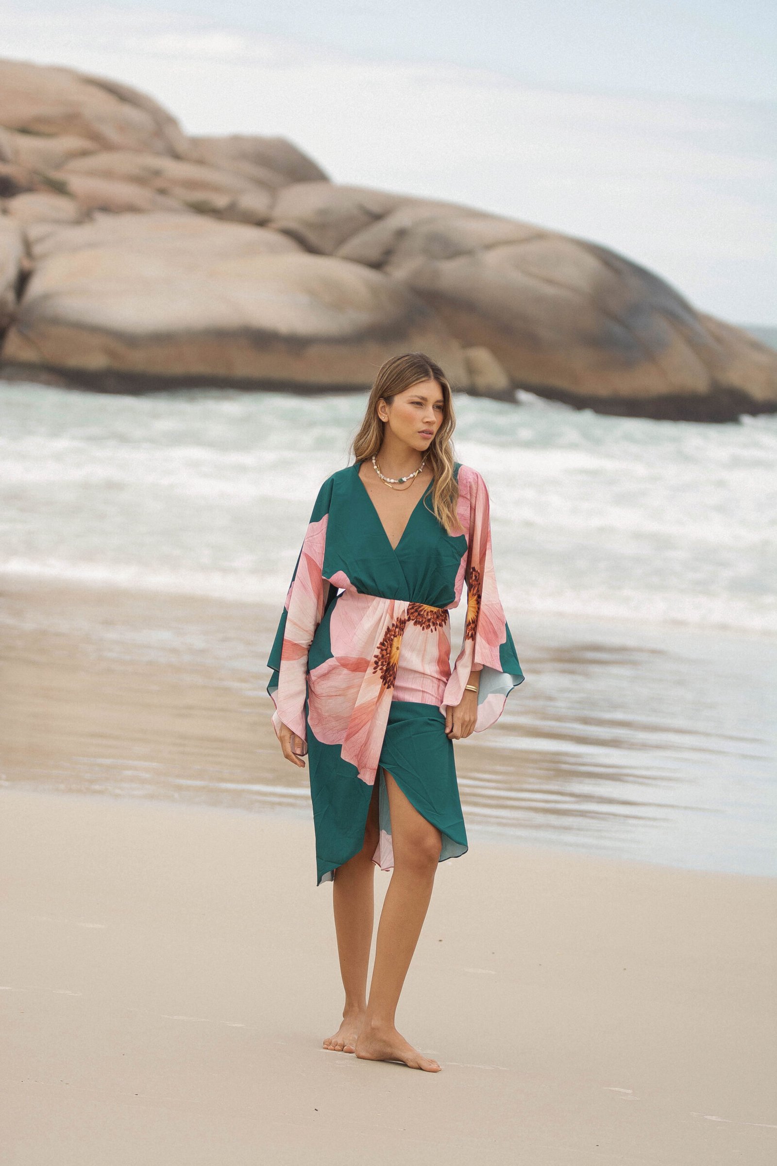 El verde profundo del fondo se encuentra con un estampado floral en tonos rosados, una flor que parece abrirse sobre la tela como si respirara con la brisa del mar: romántica, imponente y luminosa.