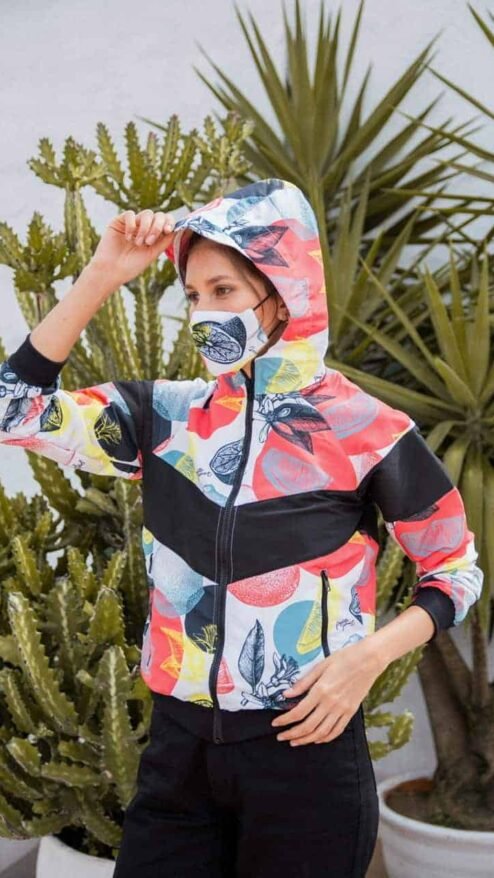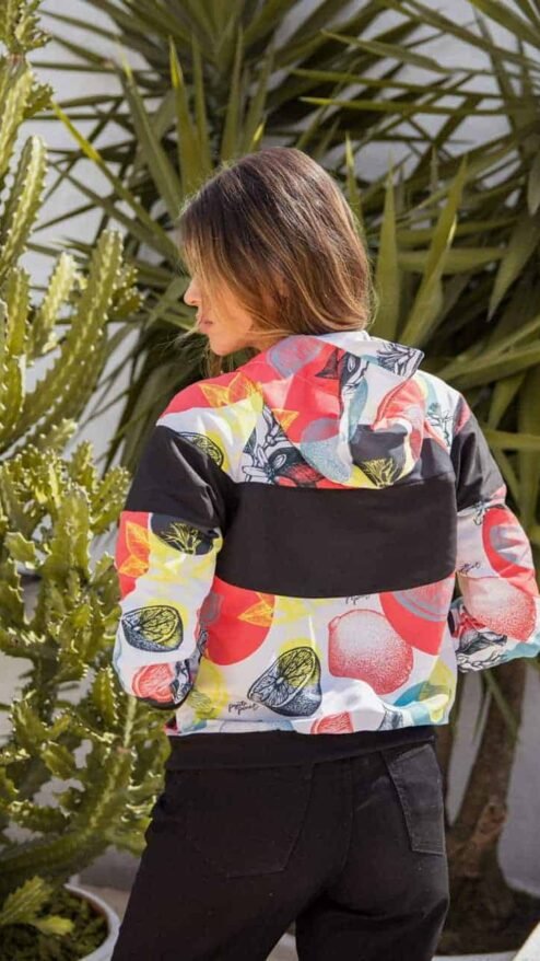 Chaqueta en antifluido con franja negra en estampado de silueta de frutas y flores, de fondo blanco.