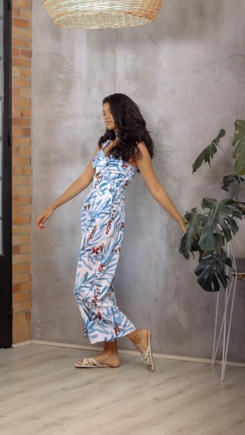 Enterizo largo de bota amplia y tiras gruesas con detalle cruzado en el pecho que genera un pequeño cut-out en la parte frontal. Cierre en la parte posterior. Estampado de hojas en color azul y frutos rojos, de fondo blanco.